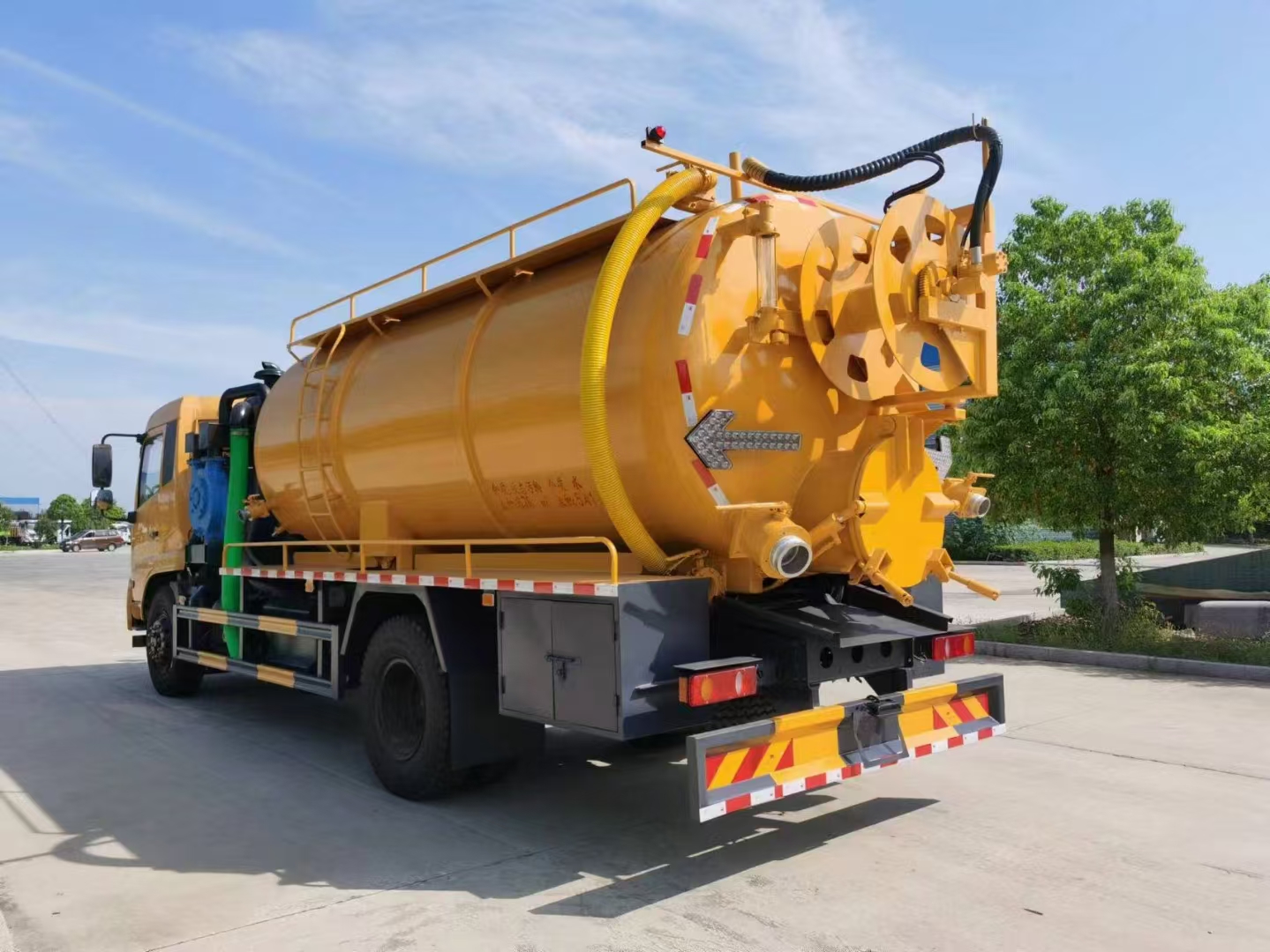 上裝配置 罐體容積15立方左右,清水罐5立方,其余為污水,罐體8mm厚,封頭8mm厚,舉升頂為自卸中置頂,副駕駛一側清水罐和污水罐用DN100球閥互通,另罐頂裝一個互通,副駕駛一側按照公告圖片安裝爬梯;清水罐:品孚350高壓泵,罐頂水車罐口一個,帶爬梯,高壓管100米22號高壓管,尾部液壓卷盤,左右各裝一個消防栓進水口,清水罐裝兩側各一個小球閥,罐底裝一個DN65排水閥, 吸污罐:一個散水罐口,罐體內部鋪1.2米不銹鋼板,罐內爬梯,罐體內部防浪板加固,水循環泵水箱為碳鋼材質.副發濰柴375馬力配SK-30水循環泵,副駕側排150鋁合金球閥,開600小蓋排污口,尾部600小蓋左側一個150排污口,右側一個100的進料口,側邊一個100排清水,罐體尾部兩側工具箱,1根10米吸污管,箭頭燈,手動油門…